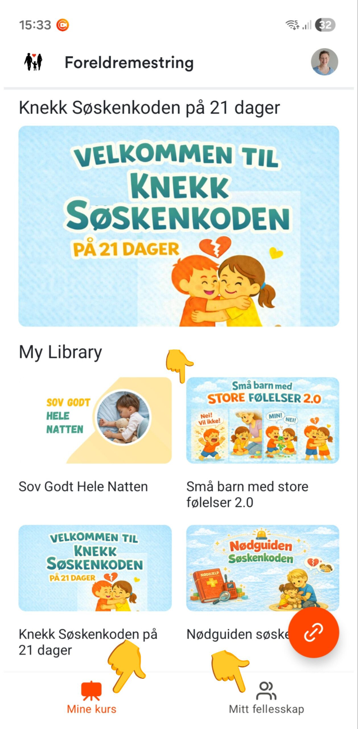 Til venstre ser du Mine kurs. Her ligger kurset “Knekk søskenkoden på 21 dager”, samt andre kurs du eventuelt har kjøpt tidligere.
